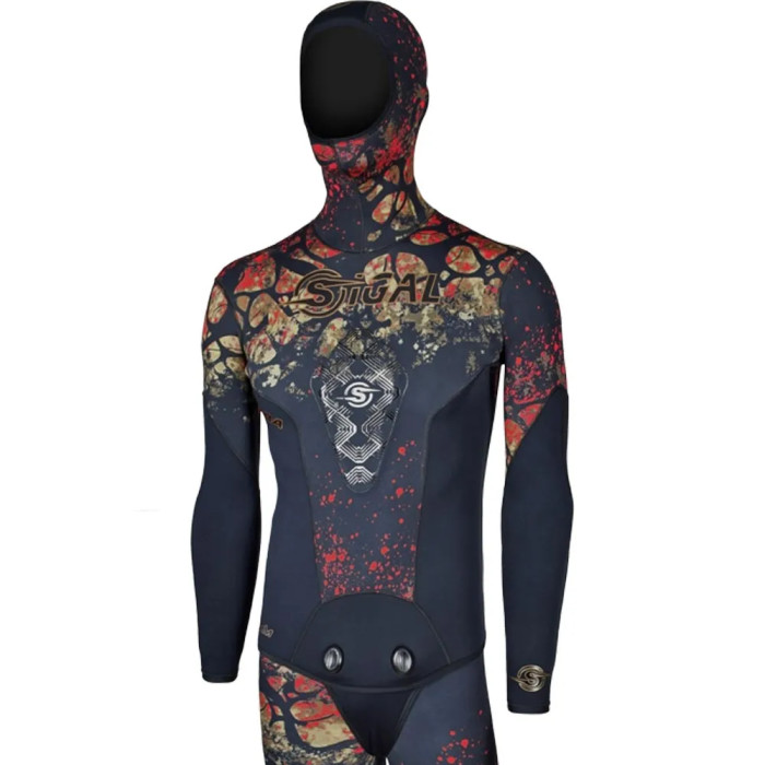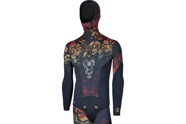 Mimetismo a Scomposizione: Il design esterno presenta un innovativo motivo mimetico che combina colori (spesso rosso, marrone e oro) e una scomposizione d'immagine studiata per occultare la figura del subacqueo su fondali variegati tipici del Mediterraneo, migliorando le possibilità di successo nella caccia.